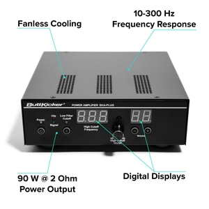 Key Features ButtKicker PLUS Power Amplifier BKA-PLUS Dimensions: 9.4″ L x 7.6″ W x 2.8 “H Weight: 3.7 lbs. Frequency Response: 10-300Hz Power Output: 90 watts RMS @ 2 ohms ButtKicker PLUS Haptic Transducer Dimensions: 8.5″ L x 5″ W x 3.75” H Weight: 2.7 lbs. Frequency Response: 5-200 Hz Piston Weight: 6 oz. Nominal Impedance: 2 Ohm Power Handling: 75 watt min. / 250 watt max. Voltage Range: 100V – 240V Universal