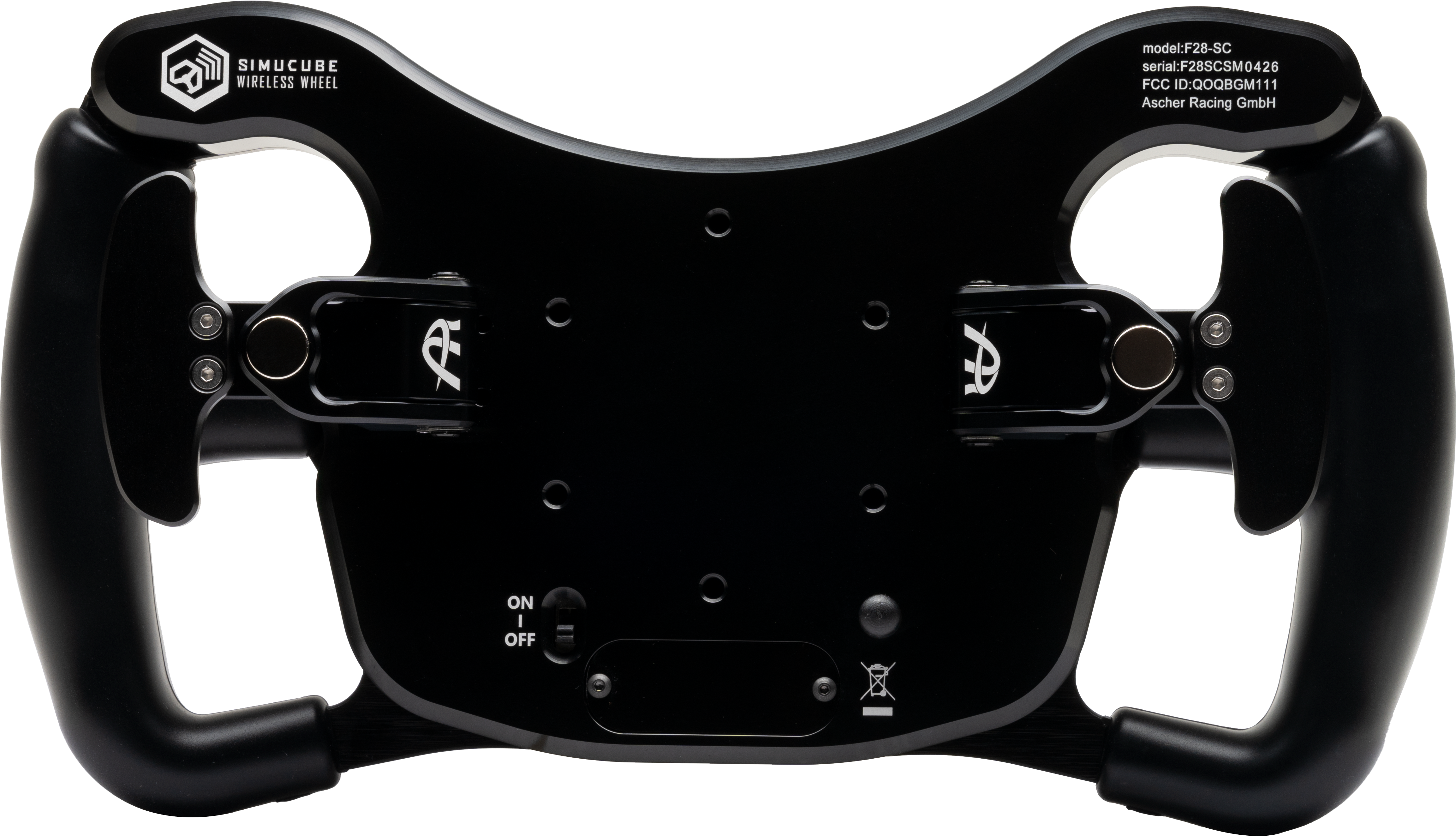 The signals of our Ascher Racing F28 V2 are transmitted to the Simucube 2 Wheel Base via an antenna. If you forget to switch off your steering wheel, it will deactivate after a period of inactivity. The lithium battery needs to be replaced only after two to three years.