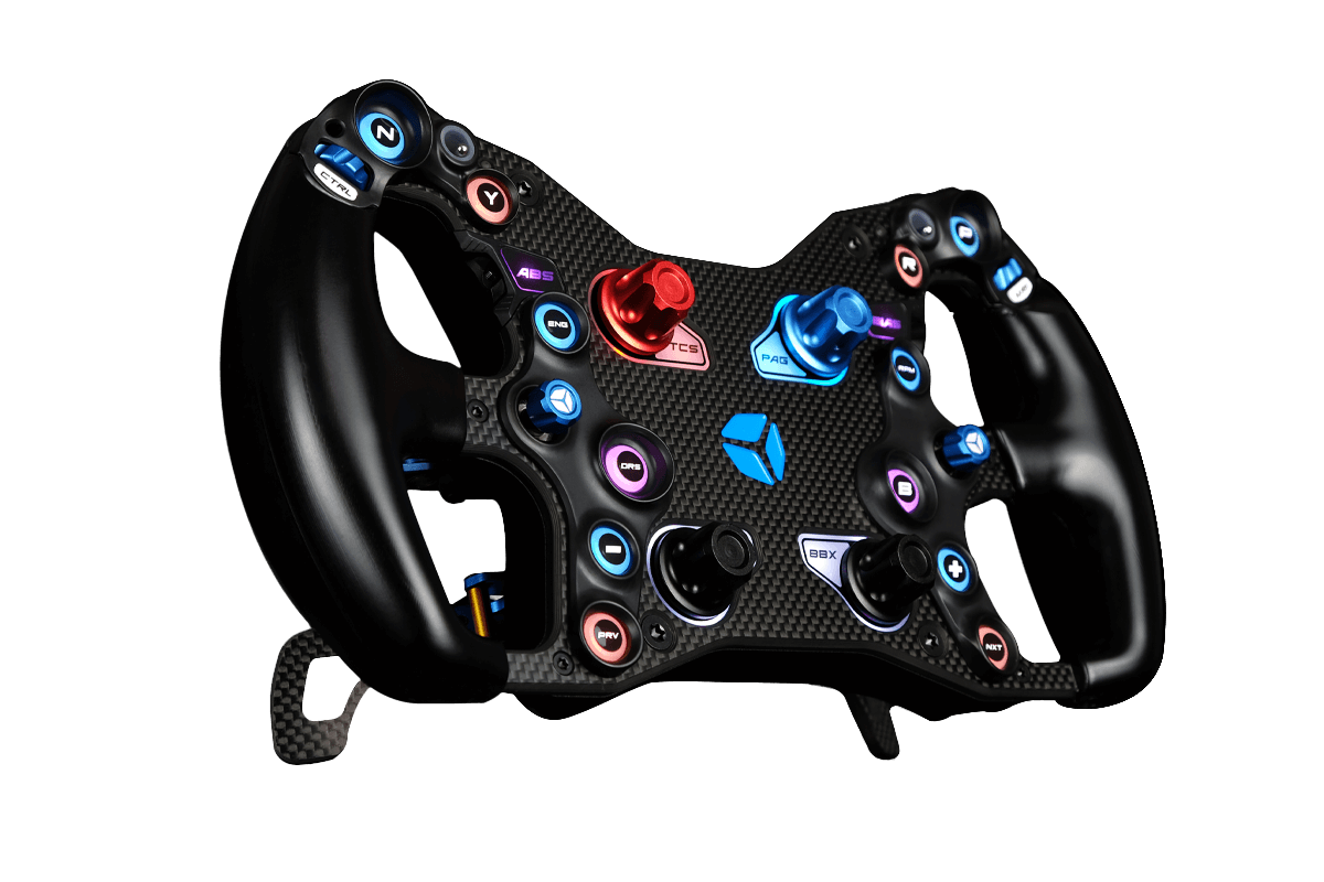 Discover our Cube Controls F-PRO. This updated Formula steering wheel features a USB+Bluetooth Dual-Mode connection and completely customizable RGB Backlit buttons giving you an unprecedented level of freedom. Featuring double joystick, magnetic connectors, custom-designed magnetic switchless shifter paddles with adjustable stop ends, ball bearing and improved tactile feedback. 100% Carbon Fiber front plate. Die-cast aluminum mainbody.